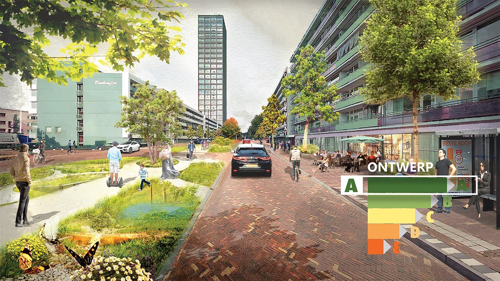 Met behulp van klimaatexperts en onderzoekers ontwikkelde Aarsen uiteindelijk het klimaatadaptatielabel. Een methode die iedereen zal herkennen door de gelijkenis met het energielabel voor bijvoorbeeld elektrische apparaten. “We maken een berekening van de oppervlaktes groen, boomkronen, waterberging en waterinfiltratie in het projectgebied. Deze onderdelen hebben een positief effect op de klimaatopgaven in de stad: hittestress, waterstress en droogtestress”, legt Aarsen uit. Uit de berekening rolt een label, tussen de A en de E.