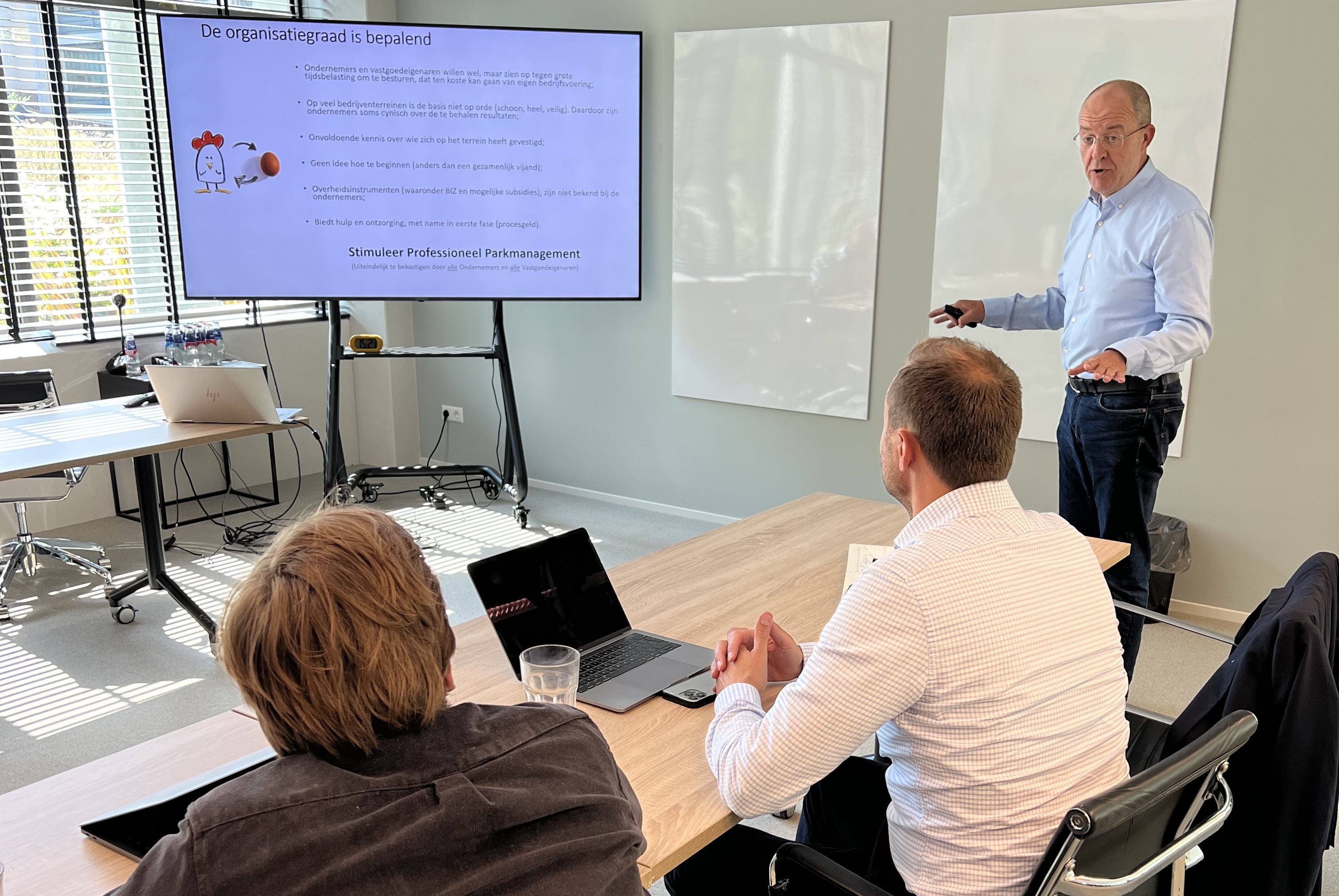 Edwin Markus van bedrijventerrein Schiebroek legt zijn organisatiemodel uit. Emiel Trommelen (Stevin) en Maarten Klein Geltink (Hedgehog) zijn aandachtig toehoorder. © Rogier Pennings