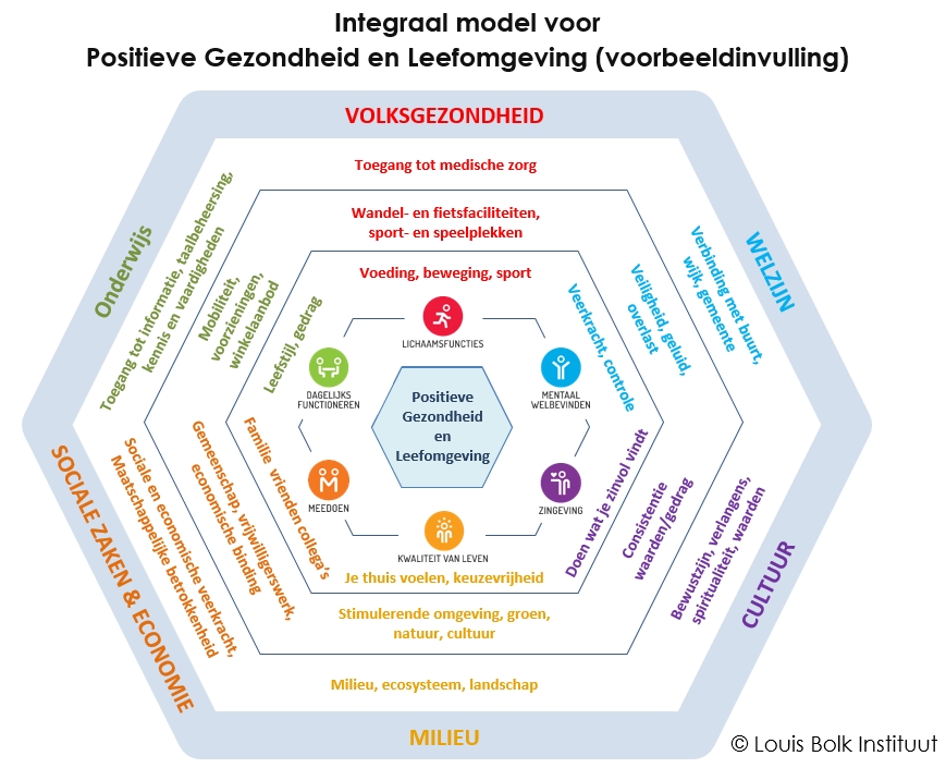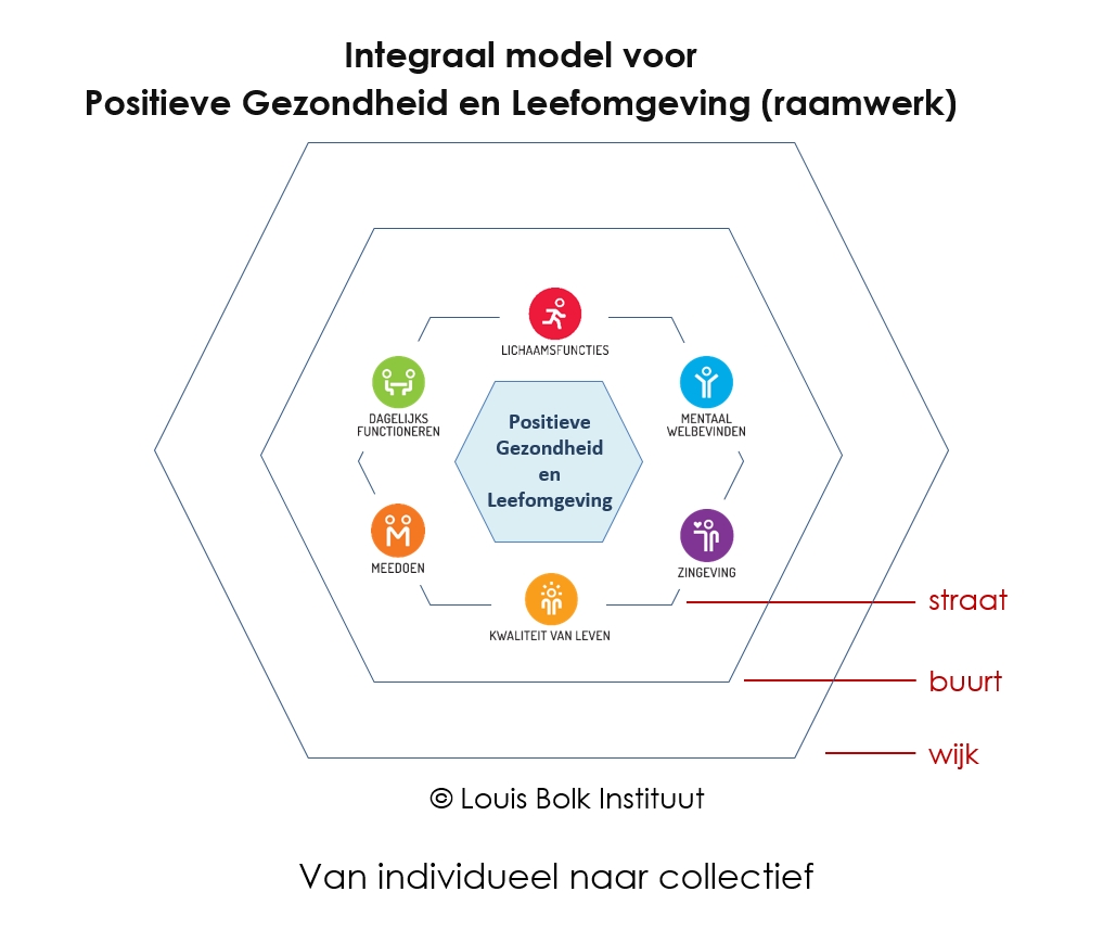 Aangezien gezondheid in de leefomgeving bevorderd wordt door veel verschillende factoren, zoals ook in het model te zien is, biedt de aanpak bij uitstek de mogelijkheid om integraal aan meerdere verbeteringen te erken. “Ons model is een mooie gelegenheid om alle opgaven te laten meewegen”, zegt Staps dan ook. “Het biedt een compleet plaatje. Het Bolk-model kan wat mij betreft ook een mooie tool zijn om te gebruiken bij de Omgevingsvisie. Ik merk dat veel gemeenten ermee worstelen hoe ze gezondheid in die visie een plek kunnen geven. Van GGD’en hoor ik dat het nog geen vanzelfsprekendheid is dat ze op tijd aan tafel worden gevraagd. Dat is kennelijk nog moeilijk te borgen. Er is veel behoefte aan integrale oplossingen, maar uiteindelijk heeft in veel organisaties elk domein nog z’n eigen afvinklijstje.” En dat terwijl de fysieke leefomgeving heel veel mogelijkheden biedt, vindt Staps. “Er gaat veel geld om in deze wereld. In situaties waarin de schop toch al de grond in gaat, is het makkelijker om ergens een gezondheidscomponent aan toe te voegen, er kan dan veel synergie ontstaan. Dit kan vanuit veel verschillende hoeken worden opgepakt. Vaak komt de vraag echter bij ons vanuit het sociale domein. Het mooiste zou zijn als Positieve Gezondheid wordt verankerd in de Omgevingsvisie, vanuit de integrale gedachte.”