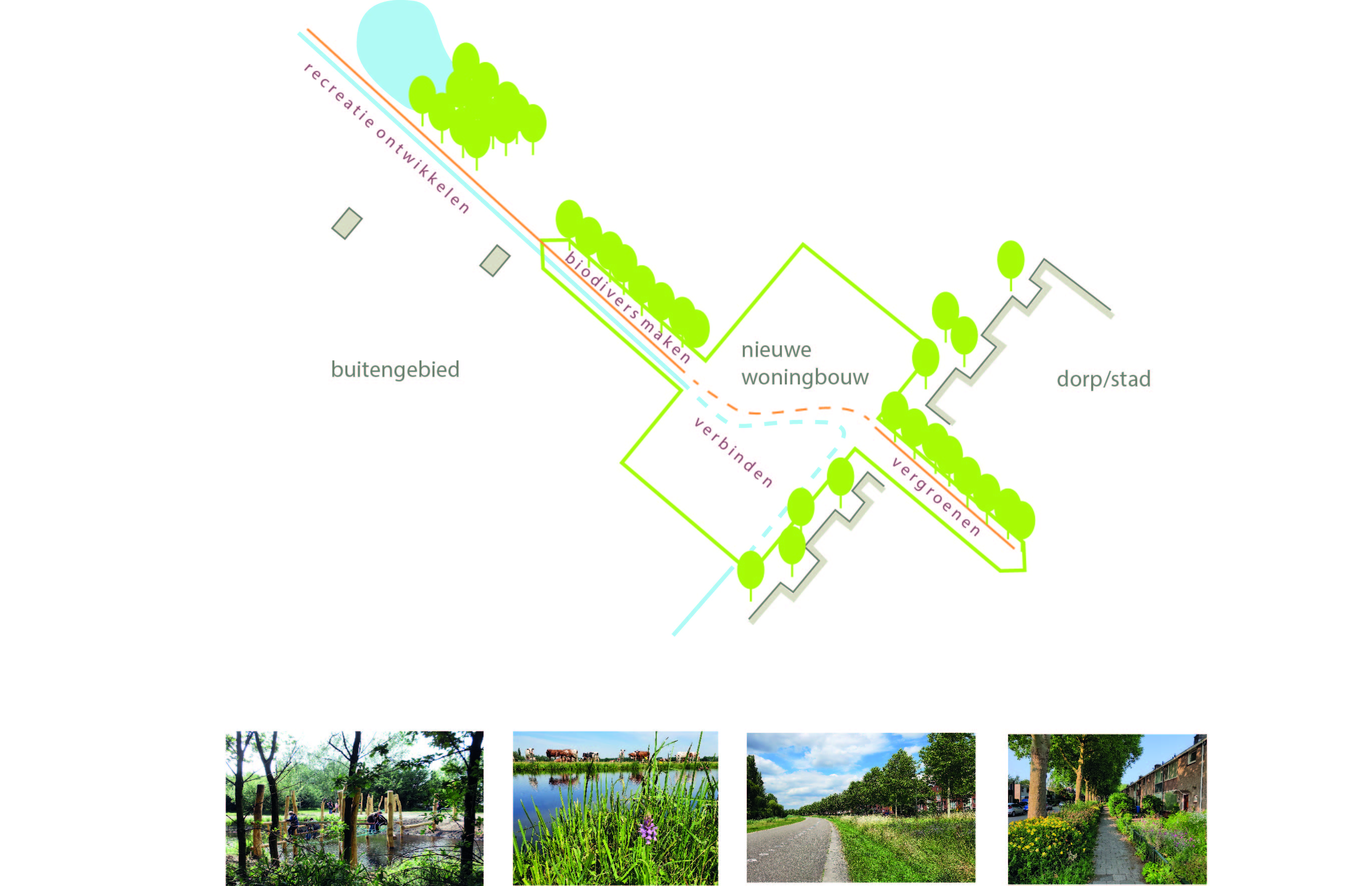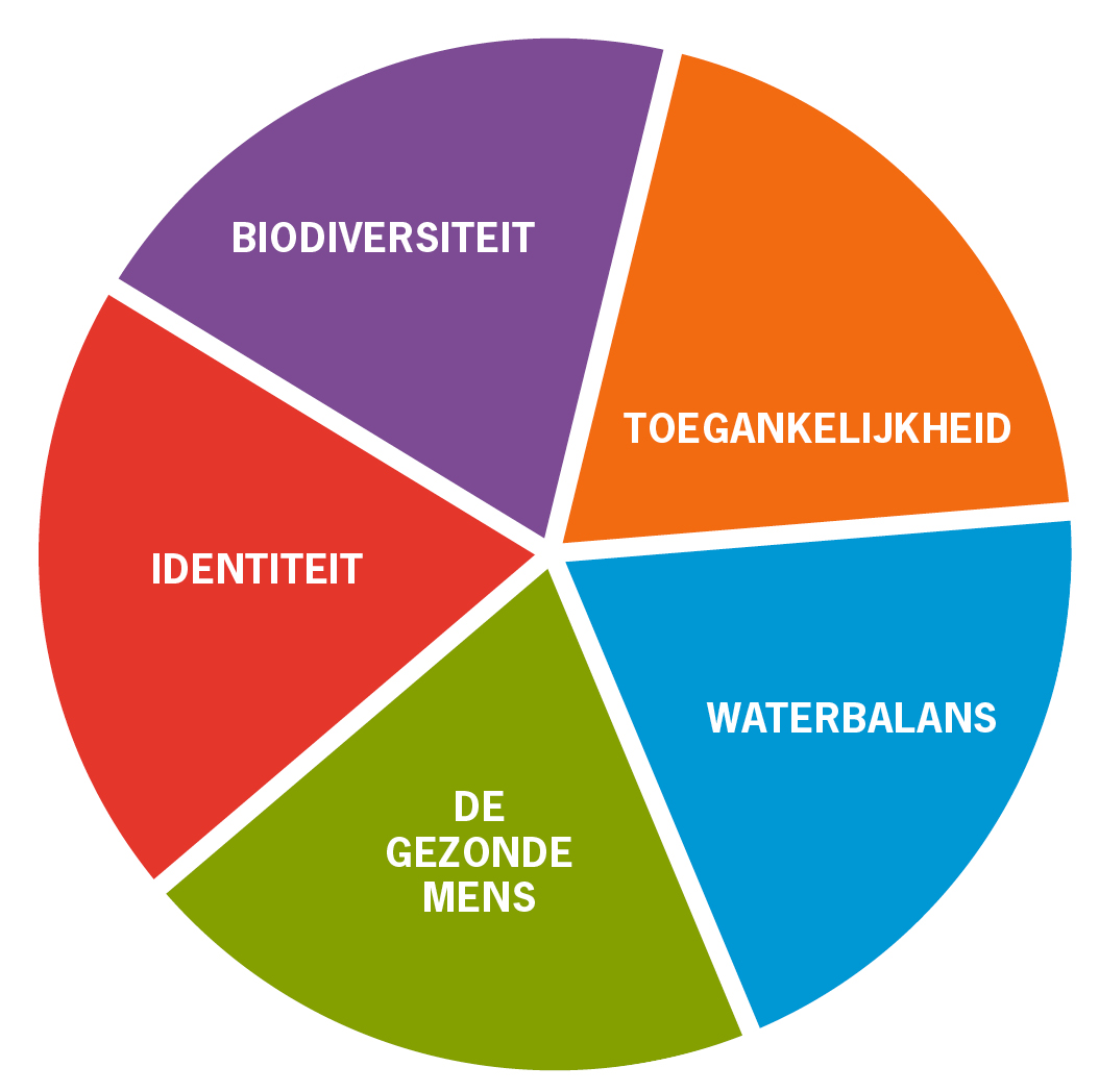 De Handreiking Nieuwe Woongebieden - groen met betekenis van voordeur tot landschap is gemaakt voor projectontwikkelaars en gemeenten om tot de juiste criteria en plannen te komen voor ‘groen’ bij uitleglocaties voor woningbouw. De basisgedachte is dat je waarde op de 5 P’s, People, Profit, Planet, Place en Public, moet creëren in al het groen dat je realiseert in de leefomgeving. Er worden hiervoor twee instrumenten aangereikt. Het ene instrument is ‘De Schijf van Vijf’. ‘Groen’ zou een antwoord moeten geven op de volgende vijf aspecten: Biodiversiteit, Toegankelijkheid, Waterbalans, De Gezonde Mens en Identiteit. Het tweede instrument is De Groene Schakeltheorie. Door aaneengesloten ‘groenschakels’ te realiseren in en om je woongebied, bereik je een samenhangend systeem van water en groen, waarbij je ook waarborgt dat de inrichting van ieder niveau van groen aansluit op de doelgroep.