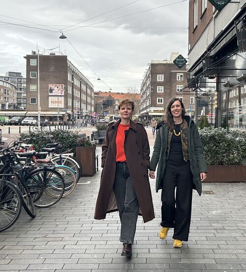 Karen van der Spek, programmamanager Rotterdam Loopt (links) en José Besselink, planoloog (rechts). “Hier lopen wij op de Meent; een Rotterdamse stadsstraat met een lekker brede stoep die goe