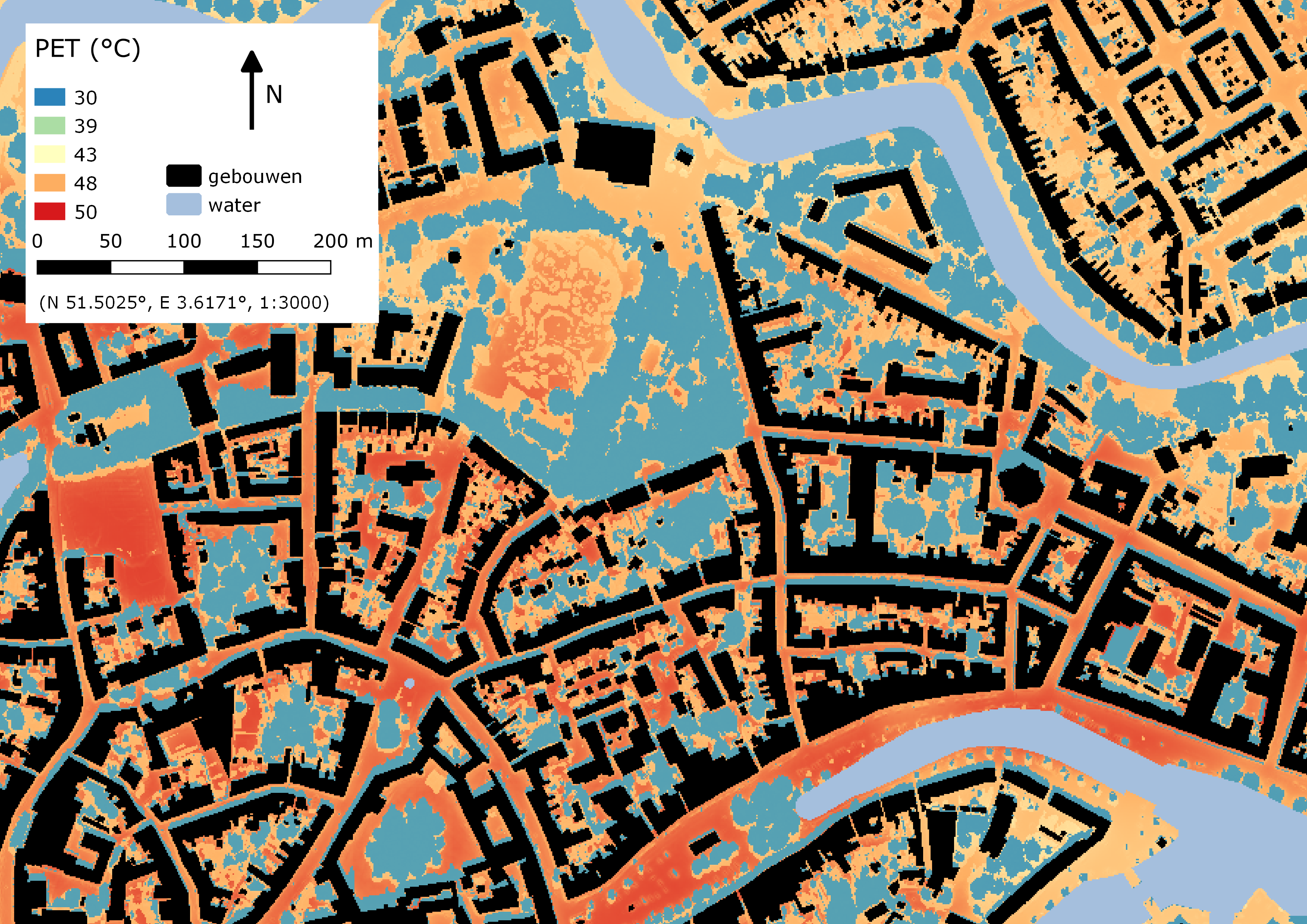 Gevoelstemperatuurkaart Middelburg, volgens het Recept Standaard Stresstest Hitte. (Afbeelding met dank aan Luc Zandbrink)