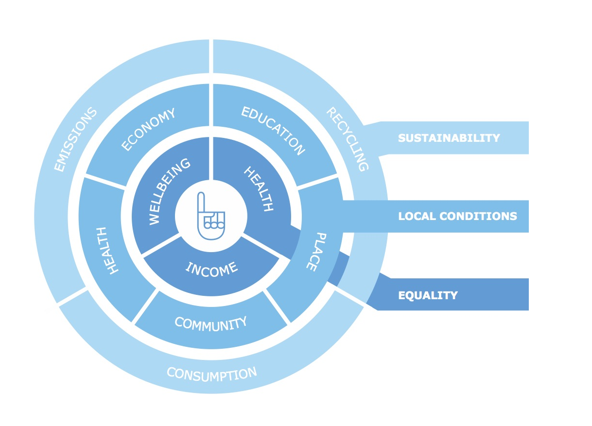 Framework van Happy City's Index of Thriving Places.