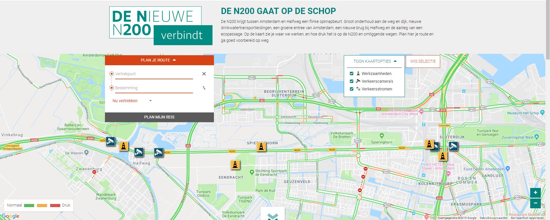 Voor De Nieuwe N200 is de website www.denieuwen200.nl een belangrijk communicatiemiddel met maandelijks duizenden bezoekers. Fentener van Vlissingen: “Een logische volgende stap was daarom de kaart van Google Maps te integreren op de homepagina van de website, geïnspireerd op het concept van www.rotterdamonderweg.nl. Zo kunnen websitebezoekers ook via deze weg hun route plannen. Bijkomend voordeel is dat weggebruikers denieuwen200.nl vaker bezoeken, en op die manier ook andere informatie en nieuws over het project meekrijgen.”