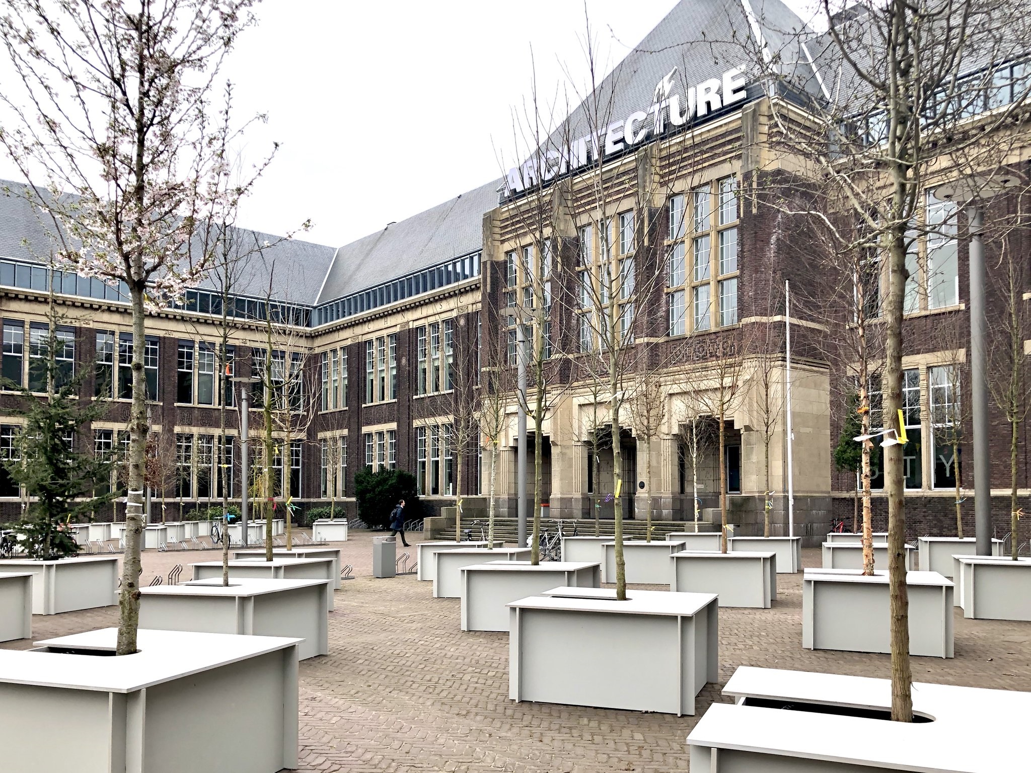 Op het voorplein van de faculteit Bouwkunde van TU Delft is een klein klimaatbos geplant. Met dit arboretum wordt onderzocht hoe verschillende boommodellen bijdragen aan het koelen van de stad.